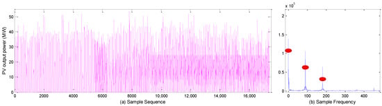 According to the decomposition principle of VMD in Section 2.1, the number of modalities is determined by studying the series of PV output samples. Figure 4a shows a sequence diagram of the PV output. Figure 4b shows the frequency spectrum after the PV output sequence is through the Fast Fourier Transform (FFT). Because there are many data, the full spectrum diagram is not easy to observe, while the spectrum diagram is symmetrical. Therefore, when analyzing, half of the spectrum diagram is to be taken for analysis.