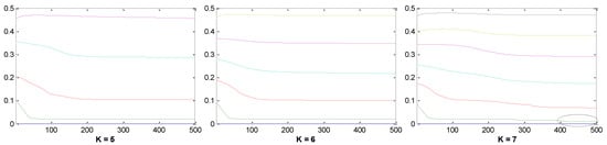 As we can see from Figure 4b, the spectrum of the sample sequence contains three major frequency band components, and the symmetry of the spectrogram and the initial value of the modal number are taken as six. When K = 5, K = 6, and K = 7, the load data are separately decomposed via VMD to obtain an iterative curve of each modal center frequency under different K values, as shown in Figure 5.