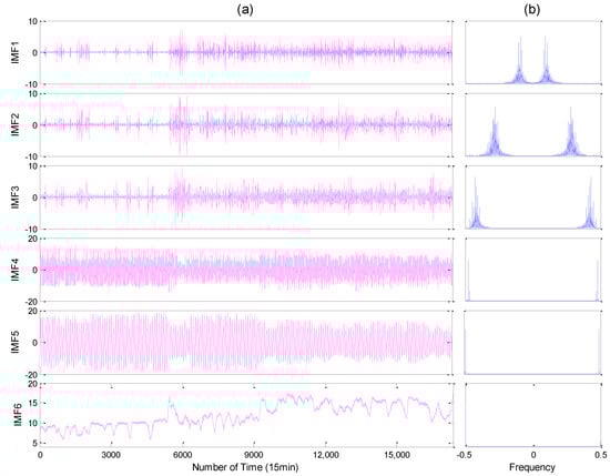 The VMD decomposition method effectively improves modal aliasing and false components that appear in decomposition when the EMD and EEMD are decomposed. From a mathematical point-of-view, the phenomenon of mode mixing is that the components of each mode are intercoupling, which does not satisfy the orthogonality requirement. False components, as the name suggests, imply that they are mathematically calculated modal components. Modal aliasing leads directly to the appearance of false components. As demonstrated above, the number of modalities here is K = 6 and the original load is decomposed. The modal decomposition diagrams and spectrograms are shown in Figure 6.