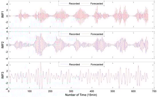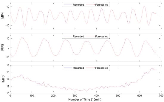 There are many methods for estimating the parameters of the ARMA model. The Least Squares Estimation method is used in this work. See Reference [43] for the specific parameters. After each parameter is calculated, it is substituted into ARMA to forecast each reconstructed component to obtain the predicted value and the fitted value of the modeling data. The residual between the measured data and the fitted value of the model data is calculated. Then, is used to describe the modeling data and to obtain the residual forecast . After that, the revised forecast value is