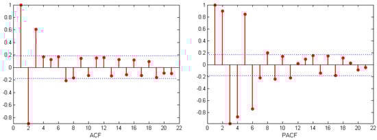 It can be seen that the PACF of AR(p) is censored at point p, while the ACF of MA(q) is censored at point q. The p can also be determined by observing the oscillation period of the PACF. In this way, the order of AR(p) or MA(q) can be preliminary determined while the model is being identified. The Akaike Information Criterion (AIC) [41] is used as the ARMA model ordering criterion. The AIC function is:
