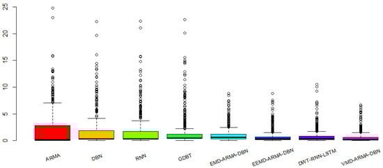 From the perspective of the absolute error distribution of the prediction results, the stability of the prediction accuracy for the single models is poor, and the error distribution interval is large. Among them, the absolute error distribution interval of each model is [0, 24.7821], [0.0051, 22.2464], [0.0082, 22.3289], [0.0363, 22.6686], [0.0005, 8.8306], [0.0018, 8.7955], [0.0008, 10.5322], and [0.0017, 6.6526], respectively, and the prediction error median is 0.1692, 0.2791, 0.2708, 0.4523, 0.5926, 0.3078, 0.0351, and 0.1414, respectively. The absolute error distribution of the VMD-ARMA-DBN model is more concentrated and the median of the error is the smallest, which is the most ideal of the eight groups of prediction models. In summary, the VMD-based multi-frequency combined forecasting model presented in this paper is superior to other models. To compare the prediction effects of each model more intuitively, we used quantitative evaluation indicators. Table 6 shows the evaluation results for each model.