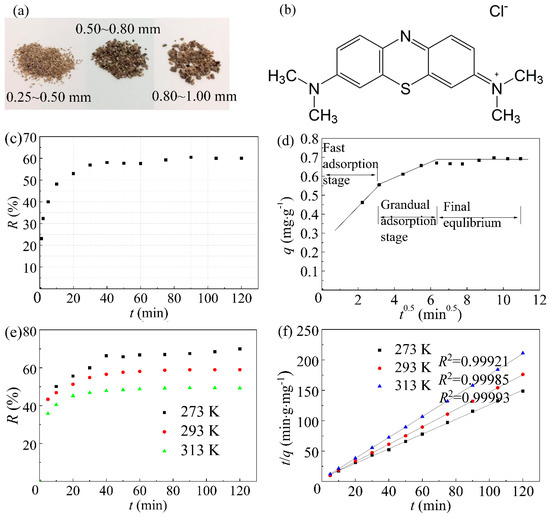 (a) Photograph of bone char with different sizes, (b) chemical structure of methylene blue, (c) effect of contact time on the removal rate of methylene blue (bone char particle size: 0.5~0.8 mm; T: 303 K), (d) three stages of the removal process of methylene blue by bone char represented by three continuous tend lines, (e) effect of adsorption temperature on the adsorption, and (f) pseudo-second-order kinetic model of the adsorption process (bone char particle size: 0.50~0.80 mm).