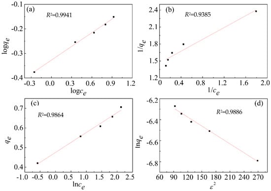 The adsorption data of methylene blue dye on bone char fitted with (a) Freundlich, (b) Langmuir, (c) Temkin, and (d) DKR isotherm models (particle size: 0.50~0.80 mm, T: 303 K, t: 15.5 h).