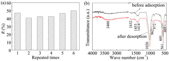 FT-IR spectra of bone char before the adsorption and after the desorption of methylene blue are shown in Figure 4b, exhibiting the characteristic bands coming from PO43− ions at 469, 561, 601, 962, and 1020 cm−1. Peaks at 1632 cm−1 and 3400 cm−1 correspond to a small amount of occluded water and O-H broad band, respectively. In addition, peaks at approximately 872, 1414, and 1453 cm−1 correspond to the carbonate bands of residual carbon in bone char [45]. The peak positions and intensities of the bone char samples have not changed, suggesting the reversible adsorption process.