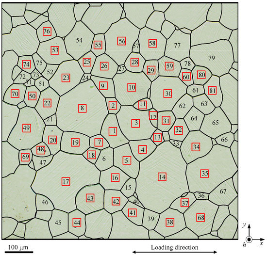 The specimen surface after the tensile test is shown in Figure 2. A fixed square area of 816 × 816 μm2 was set on the specimen’s surface for observation and measurement of the height distribution at each load step. The average grain diameter, as assessed using the planimetric procedure, was 78.1 μm. We chose 81 grains for observation (Figure 2).
