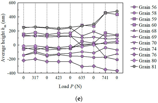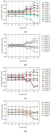 The change in the average height of each grain is shown in Figure 5. The initial average height was varied, because of the surface treatment before the tensile test. Small increases and decreases occurred until the fourth elastic load step, but hm values changed substantially at, and after, the fifth load step, which corresponded to the macroscopic plastic conditions. With respect to the change in height between loading and unloading, all grains showed opposite movements (rising and then sinking or vice versa) during loading and unloading, respectively, and this continued under the macroscopic plastic loading conditions. The extent of these movements increased substantially at the beginning of the plastic deformation stage. These random height-change behaviors of the grains were caused by microscopic inhomogeneous elastic and plastic deformations. The microscopic inhomogeneity was attributed to the crystal orientation and geometry of both surface and subsurface grains.