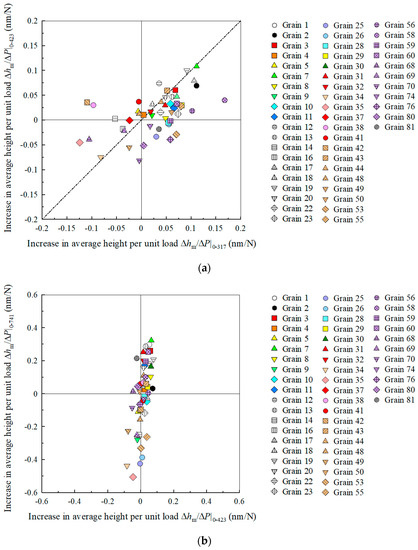 Figure 10b schematically illustrates the elastic and plastic deformation of a single-crystal grain, which was initially shown by Tada et al. [19]. Under a small stress–strain, each grain in the polycrystalline titanium deformed according to the anisotropic elastic properties of a single crystal, while the surface generally sank, because of the Poisson effect. By increasing the stress–strain, plastic deformation occurred in a direction similar to the elastic deformation, and enhanced its elastic properties. It was therefore reasonable to obtain a strong correlation between the increase in average height per unit load Δhm/ΔP occurring in both small elastic and large plastic load steps (Figure 6b). The large values of Δhm/ΔP under plastic deformation compared with those under elastic deformation (i.e., the large scale of the ordinate axis in Figure 6b) corresponded to large plastic strain in the single-crystal grains.