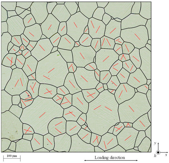 The angles of slip lines were measured after the test. In Figure 7 the straight red lines represent the direction of the parallel slip lines in each grain. As can be seen, slip lines were found in most grains, and some grains had two sets of slip lines with different angles. However, no mechanical twinning, which is usually observed as a lenticular region, was found. In the present specimen, therefore, we suspect that plastic deformation mainly occurred via crystallographic slip.