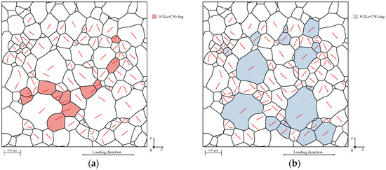 In order to investigate the collective behavior of the grains under plastic deformation, the slip lines were categorized according to their angle relative to the loading direction, as shown in Figure 8. The angle ranges were (a) 10° ≤ θ < 30°, (b) 30° ≤ θ < 50°, (c) 50° ≤ θ < 70°, (d) −10° ≤ θ < −30°, (e) −30° ≤ θ < −50°, (f) −50° ≤ θ < −70°, and (g) −70° ≤ θ < −90°, with the anticlockwise direction set as positive. Since there were no grains with a slip-line angle between 70° and 90°, the corresponding figure is omitted. As Figure 8 shows, slip lines with similar angles were found in neighboring grains, which suggests that the plastic deformation of each grain was interdependent on that of the others, and that the deformation occurred collectively. We found that a large proportion of the grains had slipped at an angle between ±30° ≤ θ < ±50°, implying that slip mainly occurred near the maximum shear direction.