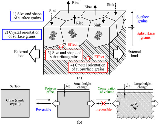 Height change of surface grains as a result of elastic and plastic deformation. (a) Rise and sink of surface grains, and deformation of subsurface grains; and (b) elastic and plastic deformation of each grain [19].