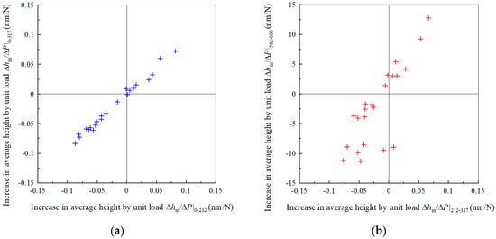 Relationship between average height change per unit load under elastic and plastic loading conditions [19]. (a) Between P = 0 N and P = 212 N (abscissa) and P = 0 N and P = 317 N (ordinate) load steps; and (b) between P = 212 N and P = 317 N (abscissa) and P = 582 N and P = 688 N (ordinate) load steps.