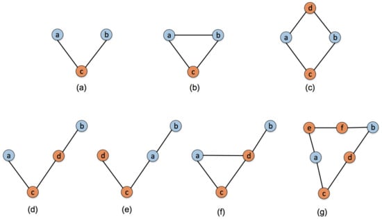 Several different connections between neighbor nodes a and b of node c. (a) node a and node b get connected by node c; (b) nodes a, b, c get connected with each other; (c) node a and node b get connected by node c or node d; (d) node a and node b get connected by node c and node d; (e) node a and node b get connected directly; (f) node a and node b get connected by node d; (g) node a and node b get connected by nodes c, d or nodes e, f.