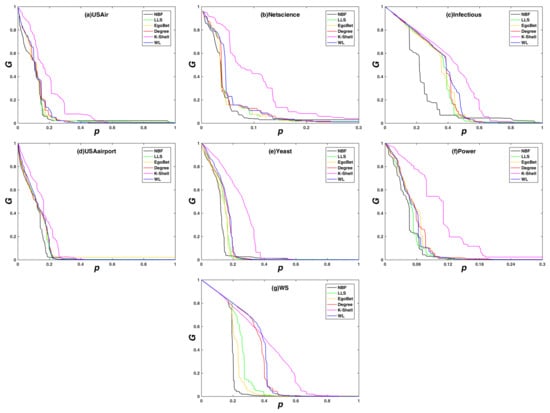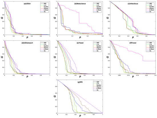 The network maximum connectivity coefficient (G) subjects with different dynamic attack strategies. Maximum connectivity coefficient (G) on the y-axis against the rate of removed node (p) on the x-axis. (a) the USAir network; (b) the Netscience network; (c) the Infectious network; (d) the USAirport network; (e) the Yeast network; (f) the Power network; and (g) the synthetic network WS.