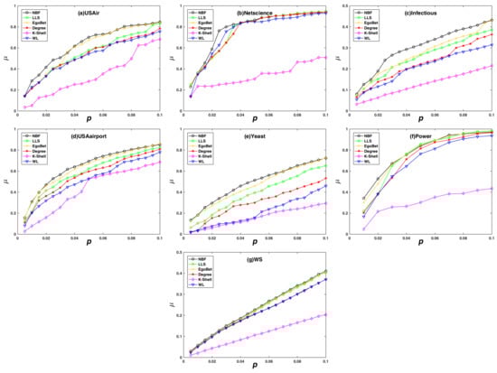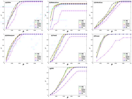 Figure 4 reflects the changes in the decline rate of network efficiency when nodes are removed in descending orders according to the importance ranking by different algorithms. The larger the value of , the more significant the decrease in network efficiency, and the more accurate the node importance identification algorithms. It can be observed that, in the static attack mode, the value of under the NBF attack strategy is larger than other strategies, which shows that the NBF algorithm is more accurate than other algorithms. Similar to the results on the network maximum connectivity coefficient, the NBF algorithm has more obvious advantages when the proportion of node removal is small, so the proposed algorithm has the best application value.