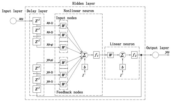 The TDRNN consists of input, hidden, and output layers. The hidden layer contains the input and feedback nodes and nonlinear and linear neurons. A feedback connection is present in the hidden layer. The time-delay memory elements () are used to store previous values of the input signal and output (feedback) signal. denotes the weight of the neuron. The weights () can be adjusted during the training process until accuracy of the neural network meets requirements. represents the bias of the neuron. and are transfer functions. The structure of the TDRNN is shown in Figure 1.