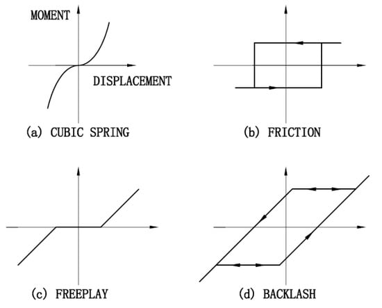 Real aeroelastic systems are often affected by a number of structural nonlinear factors, such as cubic-spring, friction, freeplay, backlash, hysteresis, time-delay, and saturation. Figure 4 shows the moment–displacement relationships of four types of structural nonlinear aeroelastic system.