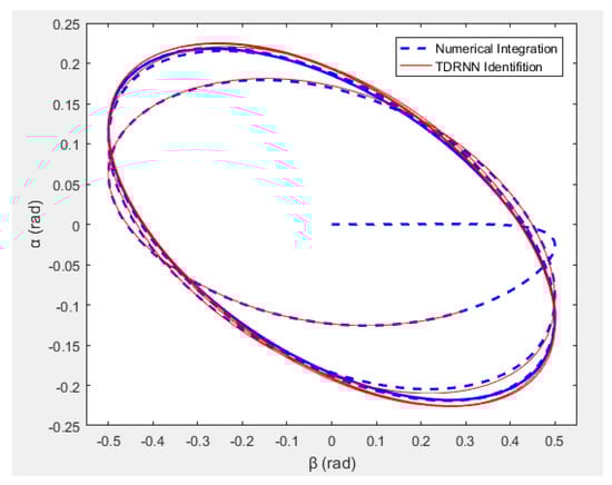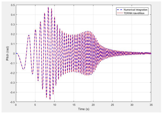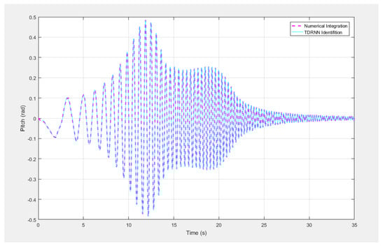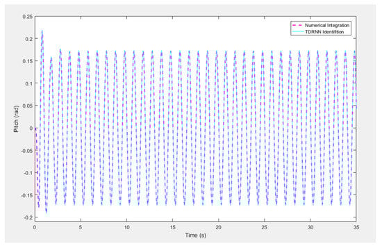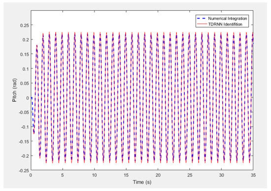 The dotted line shows the response of time-marching-integration and the solid line shows the results of TDRNN. The two results are similar and thus difficult to distinguish. The MSE of the chirp input signal is 2.6631 × 10−6 and the MSE of the sine input signal is 1.7472 × 10−6. Therefore, the identified system approaches the real nonlinear aeroelastic system effectively.