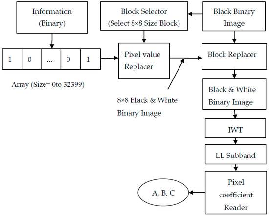 - Step 9: Extract LSB of integer coefficients based on the selected pattern and create a 4 × 4 block in the LL band of black and white binary data image respectively.