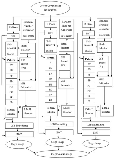 - Step 11: Repeat from Step 8 to Step 10 for the selected block until all data blocks of LL sub-band are embedded within HH sub-band of cover image in R-plane.