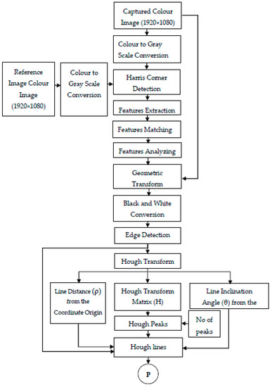- Step 10: Apply Hough transform based on the results of edge detection. This gives Hough transform matrix H, line distance ρ and line inclination θ.