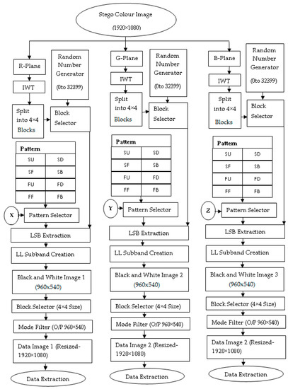 - Step 12: Apply IIWT for LL, LH and HL subbands of R-Plane and modified HH band and create R-plane of the stego image.