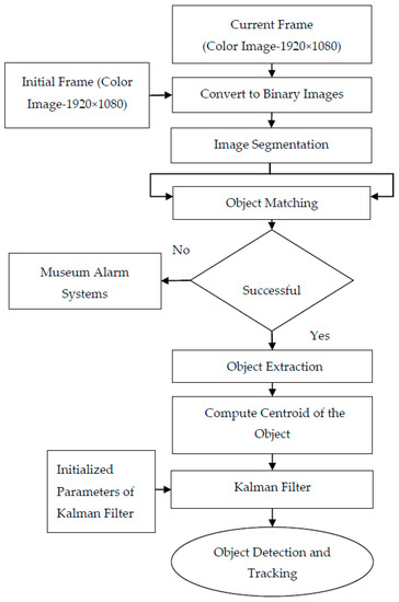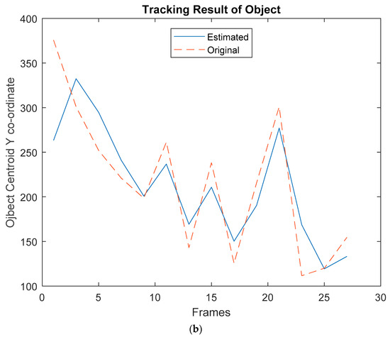 - Step 8: Initialize the Kalman filter parameters [27] such as the covariance matrix, error in measurement matrix, error in estimation matrix, initial object location (centroid), and so on.