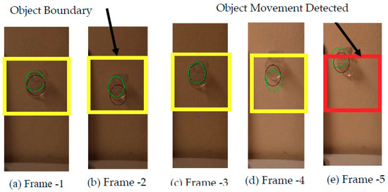 - Step 4: Find the absolute difference between an initial frame and the current frame. This gives the distortions or disturbances between the two image frames. i.e., the movement of the precious object. This step results in a black and white image with the disturbances represented by white pixels and stationary locations represented by black pixels.