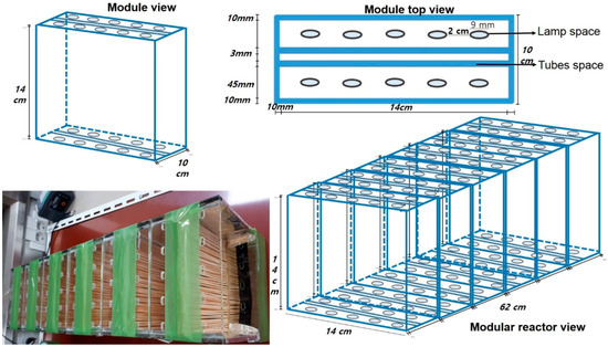 The rectangular semi pilot reactor was designed in a modular form, which is shown in Figure 1. It consists of six rectangular plastic boxes with two sides that are open. The width and length of each box is 14 cm. The tubes with the coating of the catalyst medium, Fe-ZSM-5, are installed in each module, in the space between the two rows. UV lamps are installed in the fixed space that is located outside of these tubes, which can be seen in Figure 1. Once a box (single module) is ready, it is connected to another box to form a semi pilot reactor with a length of 62 cm. The different parameters of the reactor are given in Table 1.