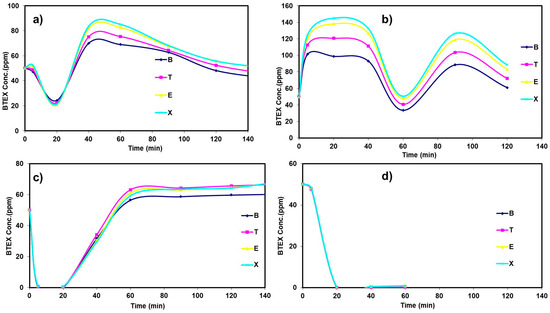 Benzene, toluene, ethylbenzene, and xylene (BTEX) concentrations with respect to time for 10 cm/3 L of 50 ppm BTEX, namely: (a) bare tube, (b) just epoxy coated tube, (c) epoxy + Fe-ZSM-5 tube, and (d) epoxy + Fe-ZSM-5 + UV (30 min).