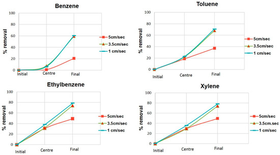 In order to study the design parameters of the semi pilot reactor (Figures S1 and S2), which were completely coupled with UV lamps, the linear velocity was first optimized. For this purpose, the reactor was connected with a BTEX cylinder (50 µmol/mol) with a pressure of 10 atm. The mixture of VOCs passed through the reactor as a result of the intrinsic pressure of the storage cylinder. Three sampling ports were used to withdraw the sample at different times. The linear velocity was measured at the outlet of the reactor, with the help of a portable flow meter probe. For each port, an air suction pump was used to gather the representative sample. The BTEX concentrations were measured at linear velocities of 1, 3.5, and 5 cm/s for optimum flow and for maximum adsorption. Figure 5 shows the proportion removed (%) for all four components using different experimental linear velocities at three points (inlet, center, and outlet) of the reactor.
