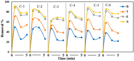 In the above section, we demonstrated the effect of linear velocity on the proportion of VOCs removed with a running time of 3 min at each velocity. After this, we studied the removal capacity of the reactor without the application of UV for a total time of 60 min at the optimum linear velocity of 3.5 cm/s. This test is a blank test for a semi pilot reactor, which means that all of the systems are functional only if the UV lamps are off, as our hypothesis was based on the fact that UV irradiation helps to remove VOCs. We observed outstanding results, which are shown in Figure 6. The outgoing gas was monitored for BTEX at time intervals of 3, 5, 10, 20, 30, 45, and 60 min. As expected, the BTEX was removed gradually and showed a minimum removal at 60 min. Moreover, the total VOC removal was calculated at the inlet and outlet of the semi pilot reactor instead of measuring the adsorption parameters and the conversion ratio to CO2 (catalysis), although, it was not the scope of study.