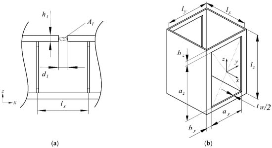 Each sample consists of 10 by 4 square cavities, ten in main flow (-) direction and four in spanwise (-) direction, respectively (Figure 1b). All liners have exactly the same cell dimensions and share the same cover and back layer design. The internal cell walls in spanwise direction were covered with polymer film. Thus, the support structure of each unit cell of the honeycomb core contains two solid walls and two cut-out walls (Figure 2). The polymer films are adhesive bonded to the cut-out walls. Depending on the dimensions of the unit cell the relative density of the support structure can be obtained by