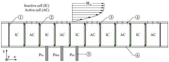 In order to enable the deflection of the flexible walls, between the active cells some inactive volume was placed between a pair of cells in the direction of the grazing sound field—which is identical with the main flow direction (Figure 3). The face sheet of each second row in main flow direction (containing the active cells—AC) is provided with the 3 by 3 perforations described above. The intermediate rows (inactive cells—IC) only have integrated pressure compensation holes. The liners’ outer dimensions in spanwise and main flow direction were chosen to fit the acoustic testing rig. The liner height was comparable to conventional acoustic liners.