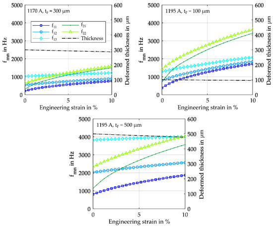 The coordinate system—which is used to describe the lateral deflection of the flexible wall—is depicted in Figure 2. The axes are parallel to the sides and of the cut-outs. The frequencies’ modes and are associated to the - and -direction. To model the pre-stress of the flexible films, an additional load resulting in a constant deformation in y-direction was included. With an increasing uniaxial stress state the film thickness decreases due transversal contraction. The resulting modal analysis shows increasing natural frequencies with an increasing pre-stress (Figure 4). The design point for the acoustic flow duct is the first eigenfrequency , which must be in the range up to 2000 Hz. The number of natural frequencies in the relevant range is very low for the sample 1195 A, , which indicates that film press stress is relevant (Figure 4).
