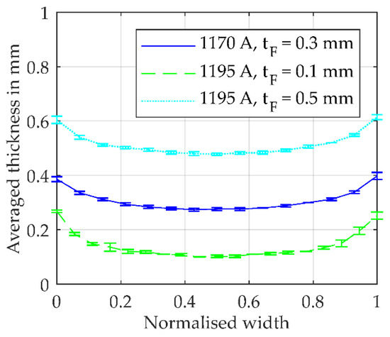 Manufacturing-related thickness variation of TPU films (semi-finished product, full width) and its standard deviation.