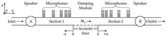 In order to assess the acoustic performance of the liner samples, measurements were conducted in the test section of the DUct aCoustic Test rig- Rectangular cross section (DUCT-R) facility of the German Aerospace Centre (DLR) in Berlin. The test rig has a length of about 8 m and consists of two symmetrical sections; each containing several microphones and a loudspeaker for acoustic excitation (see sketch in Figure 7). The cross section of the rig was 60 mm × 80 mm.