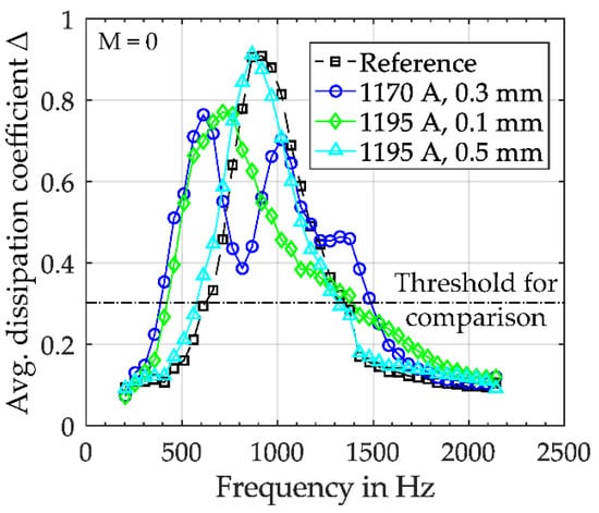 Figure 8 shows the comparison of the averaged dissipation coefficients for the no-flow case (). The reference HR liner with rigid walls (reference liner) was prepared the same with alternating active and inactive cell rows in main flow direction.