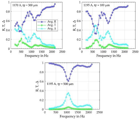 A more detailed characterisation of the flexible material was the aim of the investigation with isolated flexible structures. The results (only no-flow measurements possible) are shown in Figure 9. It can be assumed that the acoustic excitation of the flexible structure from one side propagates best to the other side of the facility, if the structure is deflected/vibrating. Therefore, an increase in transmission (green curves with diamonds) relates to a vibrating flexible structure. In addition, the material-inherent damping should be most effective, if the structure is vibrating.