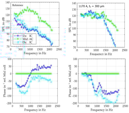 SPL values (upper row) and phase information referenced to the middle cell (lower row) for the reference sample (left) and FlexiS liner with TPU1170-0.3 (right); (acronyms: Us—upstream, Mid—midstream, Ds—downstream, AC—active cell, IC—inactive cell).