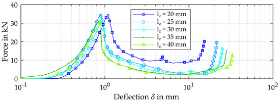 The compression tests showed a linear increase of the applied force up to the ultimate force prior to failure . After exceeding a critical deflection (Figure 12), an instable buckling failure follows (Figure 11b) which leads to a rapid decrease of compression force and plastic deformation of the damaged structure. For all specimens there was no compressive failure confined to one corner or edge of the specimen. The ultimate flatwise compressive strength is defined as , where is the total cross-sectional area of the honeycomb sample. The resulting did not show a constant trend, whereas the compression strength increases with increasing cell height. The critical deflection shows much higher deviations than the compression strength. After Buckling, starting from a relative traverse path of approximately 80%, an increase of the applied force can be seen due to a compacting of the honeycomb.