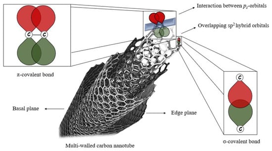 Several nanomaterials have been exploited for different purposes, but carbon nanotubes (CNT) and their composites emerged as the most exciting and versatile [,,,,]. CNT are carbon allotropes with intermediate properties between graphite and fullerenes []. They are composed by sp2 carbon units oriented as one (single-walled; SWCNT) or multiple concentric tubes (multi-walled; MWCNT) of rolled-up graphene, separated by ≈0.35 nm [,,,]. Both nanostructures had positive impacts for the applied sciences, but the latter has gained more attention due to the higher yield and lower production cost per unit, thermochemical stability, and ability to maintain or improve its electrical properties when submitted to different functionalization processes []. A general MWCNT representation and the possible π- and σ-covalent bonds established along the nanostructure are displayed in Figure 1. MWCNT also present remarkable active surface area, chemical inertness, high strength, and low charge-transfer resistance in both aqueous and non-aqueous solutions, making them suitable for numerous applications as nano-sized metallic and/or semiconducting components in transistors [], energy storage [], hybrid conductors [], supercapacitors [], thin-film coatings [,,], field emitters [], (bio)fuel cells [,,,], photovoltaic devices [,], electromagnetic shields [,], and electrochemical probes [,,,,].