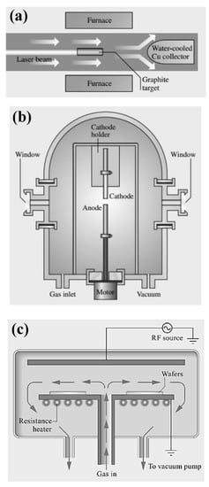 General layout of an (a) electrical arch-discharge (adapted by permission from Reference []), (b) laser ablation (adapted by permission from Reference []) and (c) chemical vapor deposition apparatus (adapted by permission from Reference []) used to synthesize multi-walled carbon nanotubes.