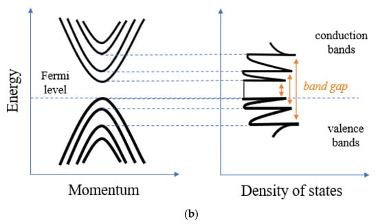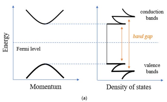 where ħ is the reduced Planck constant, is the Fermi wavevector, and represents the mass of the nanostructure under study. These values are not well-defined in cases where the Fermi surface is non-spherical, but it is estimated to be for semiconductors or even higher for conductors []. This prevision corroborates the observation recorder in the density of states diagram for SWCNT with different chirality, since at the Fermi energy level (EF) there is a finite electronic transition for metallic structures (first van Hove optical transition), but a zero-band gap for semiconductors (second van Hove optical transition). A general description of the band structures and density of states for metallic and semiconductor nanotube is presented in Figure 4. Thus, if we imagine that MWCNT are composed by several coaxial SWCNT, it might be expected that they are not strictly a 1D-type conductor [,]. Likewise, when the nanotubes have different chirality, the band structure undergoes alterations, and the resultant coupling between the electronic states at the EF and phonon modes may cause superconductivity [,,]. Despite the similarity with metallic materials, the carrier density in carbon nanotubes (1D quantum wires) is much lower and novel physical electron-electron phenomena (such as spin-charge separation and suppression of the electron tunneling density of states) should be considered to justify the possible discrepancies, as predicted by Luttinger liquid theory [,,,].