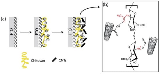 (a) Schematic representation of the layer-by-layer and (b) supramolecular interaction between chitosan and multi-walled carbon nanotubes (MWCNT) for 1-bilayer film (adapted by permission from Reference []).