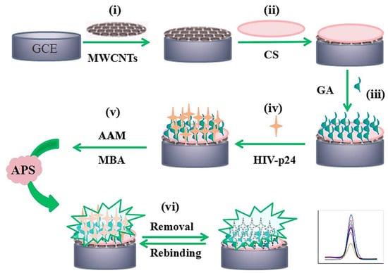 Detailed procedure diagram for fabrication of the HIV-p24/CTS/MWCNT/GCE sensor (adapted by permission from Reference []).