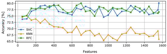 For SVM and RFC, the accuracy increases steadily up to 400 features. After this point, the accuracy decreases and rises repeatedly, and the values usually do not exceed the limit of accuracy that was reached with 400 features. On the other hand, the accuracy of the KNN classifier shows a decreasing tendency with an increasing number of features. This is probably due to the higher dimensionality of the data space since the KNN classifier is known to suffer from higher dimensions. Even though, in this case, the accuracy of KNN dropped in higher dimensional cases, this is not always the case, as can be seen, for example, in [].