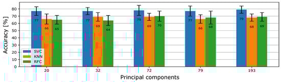 The goal of this section is to compare the accuracy of the classifiers with data of reduced dimensions. The first step was to set the number of principal components that make up a new set of training and test data. As with the previous selection method, the hyperparameters of the classification model were tuned with these new data in the training process. An overview of the accuracy of the classification results using the PCA method for different numbers of principal components is shown in Figure 6.