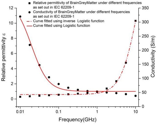 Meanwhile, values under a low-frequency limit and high-frequency limit of permittivity of the dispersion regime = 46.38243 and = 39.03617 were highly consistent with corresponding values = 319.7, = 38.11. Thus, verifying that the method was reliable. In the same way, other tissue and an organs’ electromagnetic parameters can be obtained: