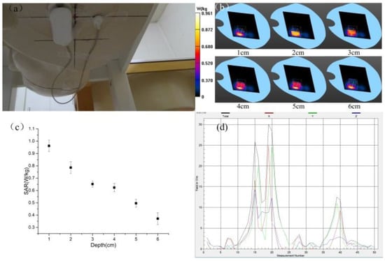 Test results of a wearable Electrocardiograph (ECG) sensor. (a) Test configuration of ECG sensor, (b) test waterfall chart from SAR test (maximum value of SAR = 0.961 W/kg); (c) test result of SAR at different distance; (d) absolute values of three-dimensional electric field intensity from different locations.